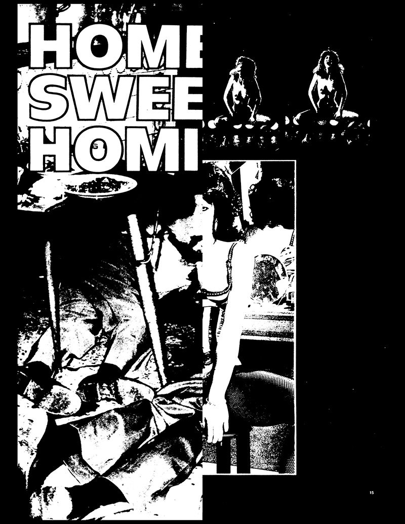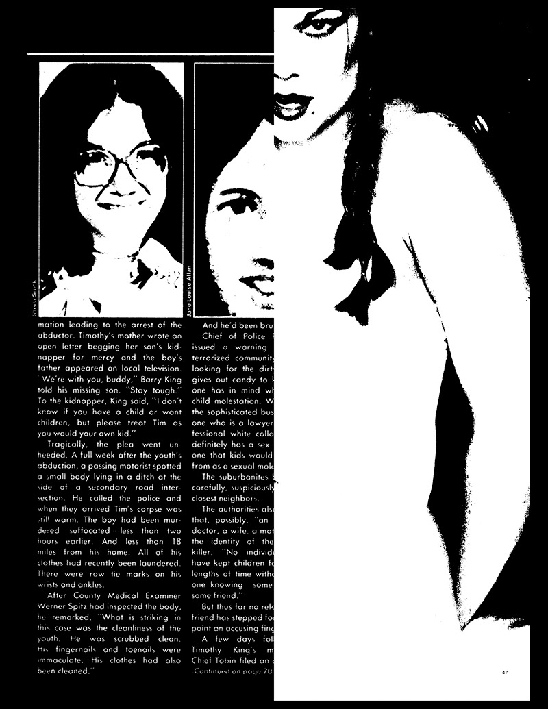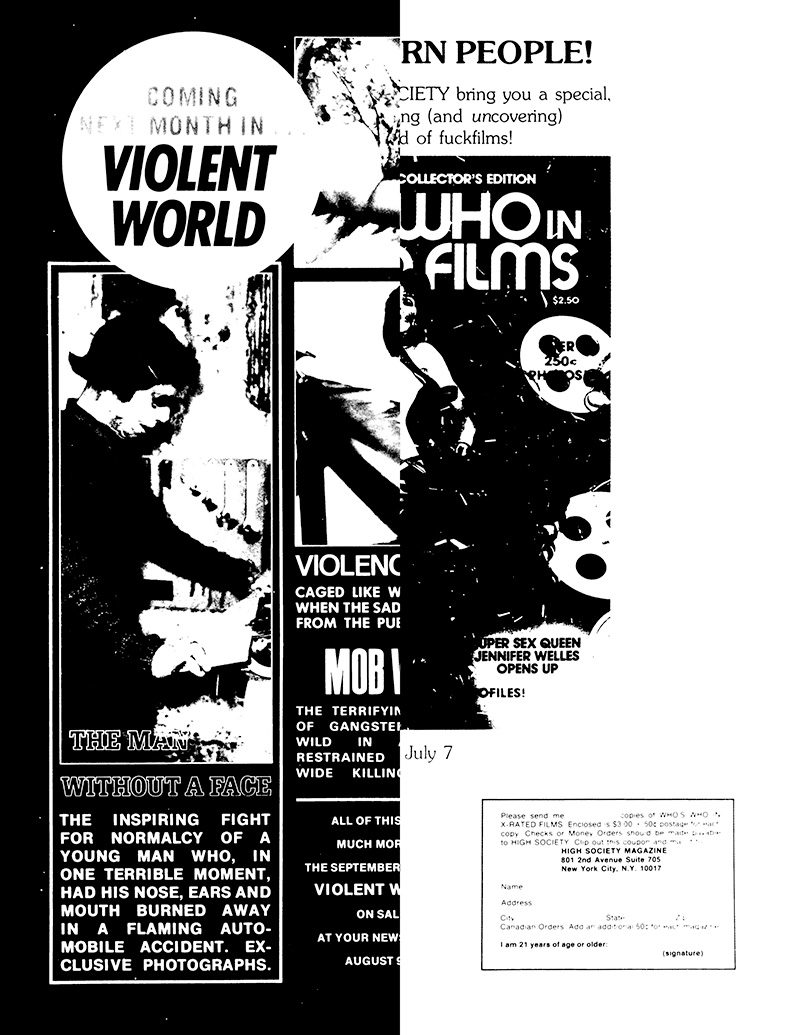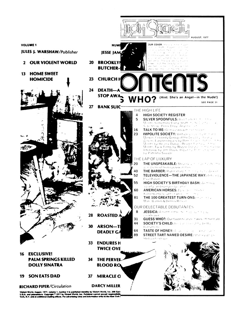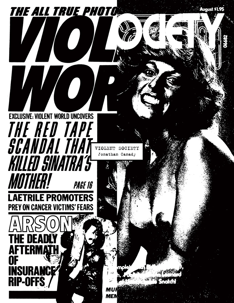 This publication is made up of two August, 1977 magazines, “Violent World” and “High Society” digitally collaged 50/50 by corresponding pages. Printed in a hand-numbered limited edition of 50 copies (SOLD OUT).