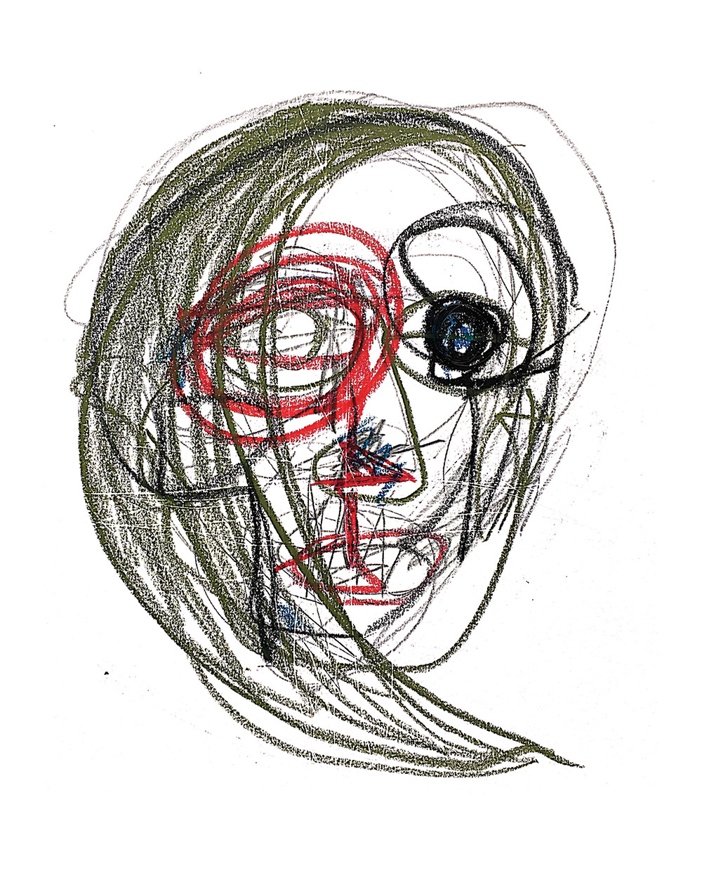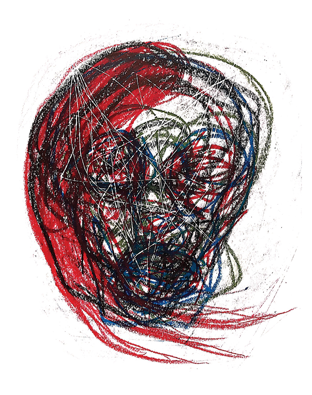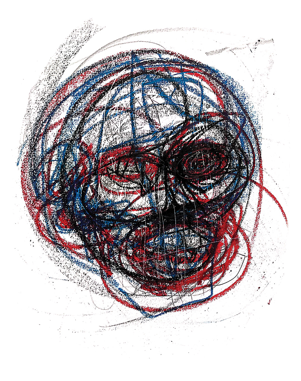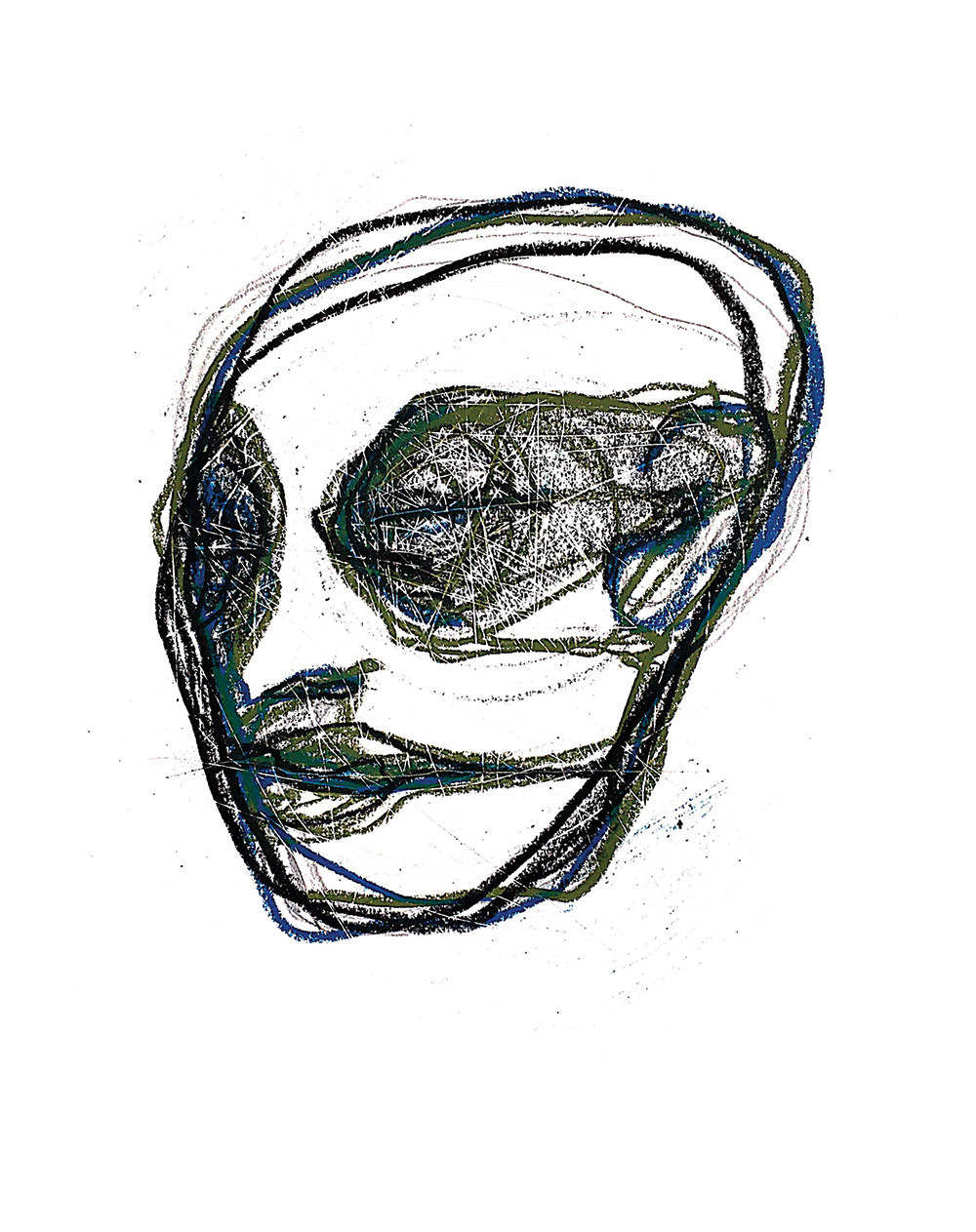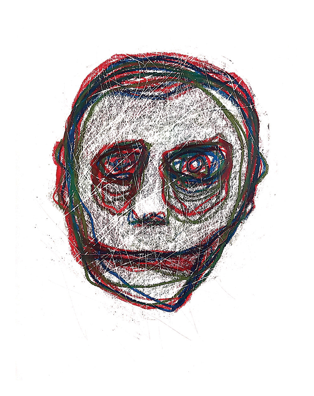 The face is empty because the mind is searching for an answer to the biggest questions. If there is any justice, the expression will turn to one of acceptance, not despair. All works are wax oil pastel and pencil on paper, 12 x 9”.