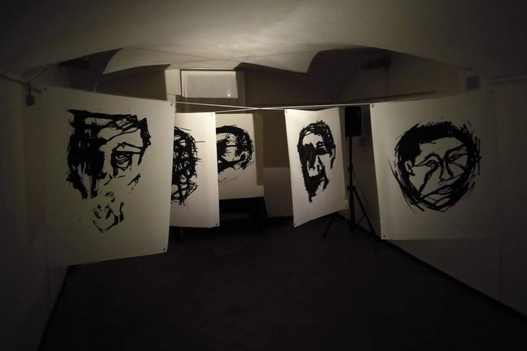 The above India ink drawings were enlarged into hand-painted 45 x 36″ canvas pieces. The following photo is from the “My Dark Hunger” exhibition at Ikigai Room, Bologna, Italy in June of 2019.